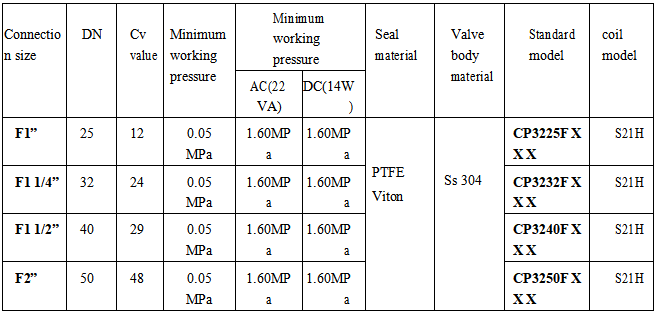 CP32 series. Normally open S21H coil. Maximum pressure 1.60MPa Flange connection